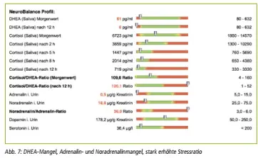 In meiner Praxis arbeite ich mit dem Neurobalance Profil. Für den Test sendet der Patient den zweiten Morgenurin zur Bestimmung der Neurotransmitter sowie 7 Speichelproben zur Bestimmung des DHEA-Spiegels und des Cortisol-Tagesprofils ein. (Abb. 1-7)